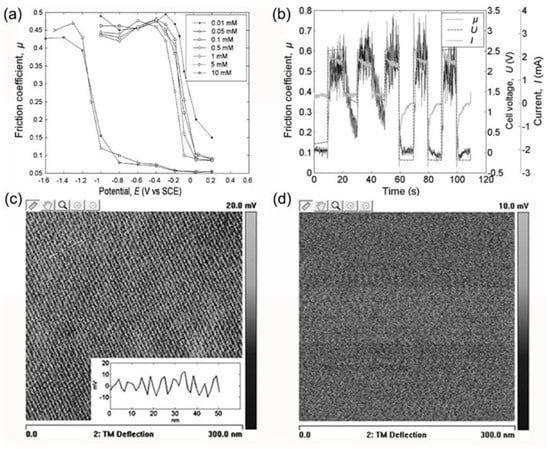 Influence of electrode potential on COF and surface morphology under varying SDS concentrations. (a) Correlation between COF and electrode potential across distinct SDS solution concentrations. (b) Variation of COF under multiple times and different step voltages. (c) Stripe-like adsorption pattern of SDS molecules on the electrode surface at open circuit potential (0.03 V vs. SCH) in 1 mM SDS solution. (d) Absence of SDS molecule adsorption on the surface at a negative potential (−0.4 V vs. SCH). Reproduced from [12,68], with permission from Springer Nature.