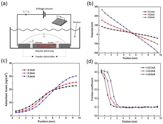 In a three-electrode electrochemical system, the counter electrode’s relative position to the working electrode or between the counter electrode and the friction region influences the electro-controlled friction behavior on the working electrode surface. When the counter electrode’s relative position and the friction region are adjusted so that the friction region falls within the electrode’s influence, the potential exhibits a substantial modulating effect on friction performance. Conversely, when the friction region lies far from the electrode’s influence, the potential-controlled friction effect is not achieved [41]. In a bipolar electrode system, the rational design enables spatial positioning of the electrode surface potential to control frictional properties at different locations on the electrode surface [121]. Investigations using imaging surface plasmon resonance (ISPR) and ellipsometric polarization spectroscopy have examined this gradient distribution of molecular films. By varying the solution current, the distribution of molecular adsorption with spatial location can be modulated [122], and the adsorbed film can serve as a boundary film. The boundary lubrication effect is closely related to its adsorbed amount and adsorption structure [123]. It is hypothesized that using bipolar electrodes as friction subsets allows the spatial distribution of electric potential to control the friction coefficient distribution with spatial location. Supporting this conjecture, Zhang et al. [41] achieved a gradient distribution of the COF over the spatial position on a bipolar plate. By examining the surface potential and molecular adsorption at different locations on the bipolar plate, a gradient distribution was observed for both surface potential and SDS molecular adsorption, as illustrated in Figure 6. This finding indicates that the potential’s gradient distribution caused the SDS molecular adsorption to exhibit a gradient distribution, subsequently leading to a gradient in the COF. The authors propose that this method of controlling the COF variation with electrode position may hold significant implications for metal-forming processes. For instance, in a drawing process, low friction is necessary for the die area to reduce sliding resistance and tensile stress in the cup wall, while high friction is required at the die corners to facilitate metal flow.