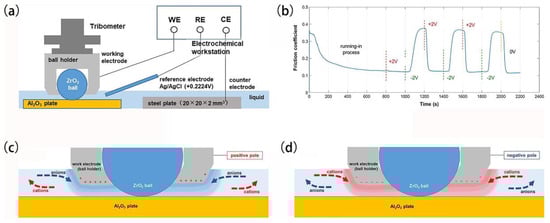 In the investigation of tribological property regulation through potential-controlled adsorption and desorption of surfactant molecules, the friction pairs typically involve at least one metallic component. Recently, Liu et al. [42] devised a novel friction system to achieve reversible control of the friction coefficient between an Al2O3 disc and a ZrO2 ball in a solution containing SDS and NaCl (Illustrated in Figure 7). They introduced an indirect adsorption–desorption model, which posits that, despite the non-conductive nature of the friction pair, variations in the electrical properties of the metal ball holder for fixing ceramic balls influence the local concentration of surfactants and ions with distinct electrical characteristics. Consequently, this indirectly impacts the adsorption and desorption behavior of surfactants and ions within the contact region, resulting in potential-dependent alterations in the friction coefficient.