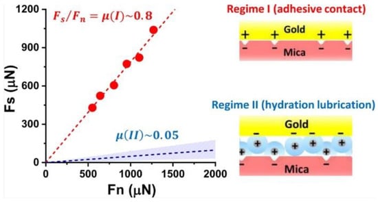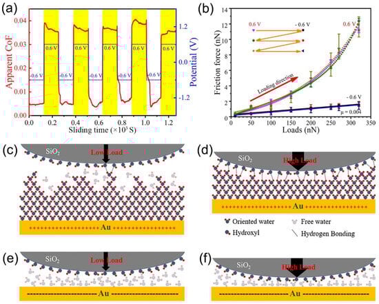Water molecules, although neutral, exhibit substantial dipole moments. In aqueous solutions, these molecules tightly associate with charged or amphoteric ions, forming hydrated layers [65,71]. Research has demonstrated the effective load-bearing and lubricating properties of metal cation hydration layers [72,73,74]. By modulating the adsorption and desorption of hydrated ions on electrode surfaces, significant alterations in the tribological characteristics between the electrode and contact substrate can be achieved. Gao et al. [75] reported a reversible shift in the COF between graphite electrodes and SiO2 microspheres in a Phosphate-Buffered Saline (PBS) solution, driven by potential changes. At positive potentials, enhanced interfacial interactions occurred due to electrostatic and hydrogen bonding reactions between negatively charged hydrated ions adsorbed on the graphite electrode surface and positively charged hydrated ions adsorbed on the SiO2 microsphere surface, resulting in increased friction. Conversely, at negative potentials, the adsorption of positively charged hydrated ions between both surfaces led to low shear forces and, consequently, reduced friction coefficients. Tivony et al. [32] examined frictional energy dissipation between gold electrodes and mica sheets at varying potentials in LiClO4 solutions. They found that at negative potentials, the low shear stress between the gold electrode and hydrated cations accumulated at the mica interface resulted in minimal energy dissipation. At positive potentials, hydrated ions were expelled from the interface between the electrode and mica sheet, causing direct contact between the rough peaks of both surfaces and substantial frictional energy loss, as depicted in Figure 8. Nonetheless, the mechanism underlying high frictional energy dissipation at positive potentials on gold surfaces remains a subject of debate. Experimental results from a surface force apparatus (SFG) and AFM indicate that under positive potentials in the electrolyte, a viscous ice-like water layer forms on the gold surface [76,77,78,79]. Pashazanusi and Li et al. [33,34,80,81,82] proposed that strong hydrogen bonding between this ice-like water layer and the polar friction materials accounts for the high friction. Thus, the tribological mechanism of potential modulation on gold surfaces in salt solutions warrants further investigation.