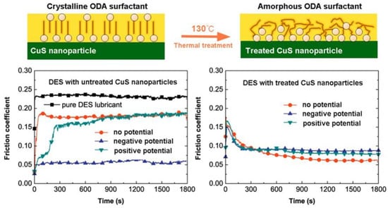 Modulating the adsorption and desorption of polar nanoparticles on heterogeneously charged solid surfaces has been found to significantly alter interfacial tribological behavior. Examples include functionalized graphene [83], molybdenum disulfide [58], heat-treated CuS particles [84], functionalized SiO2 particles, carbon quantum dots [85,86], and charged oxide nanoparticles [87,88]. Typically, potential-induced adsorption of charged nanoparticles on electrode surfaces leads to redox reactions via friction-assisted effects. For instance, fluorinated graphene electrodeposited on stainless steel forms metal-fluorine bonds with the substrate [83], while molybdenum disulfide generates MoS2/MoOx under potential influence upon deposition on metal surfaces [58]. However, a recent study by Liu et al. [84] demonstrated that CuS nanoparticles did not undergo chemical reactions with the substrate due to friction. The authors investigated the potential-controlled friction response properties of aminated CuS nanoparticle additives in a diethyl succinate lubricant. The lubricant containing aminated CuS nanoparticles exhibited a pronounced potential-controlled friction effect, characterized by low friction coefficients at negative potentials and high coefficients at positive or zero applied potentials. This behavior can be attributed to the positive electrical properties of the aminated CuS nanoparticle surface, which enables adsorption on the electrode surface at negative potentials, subsequently acting as a boundary lubrication film. However, heat treatment of the aminated nanoparticles led to disordered surface amination molecules, weakening the nanoparticles’ electrical properties and diminishing the friction coefficient’s responsiveness to potential (see Figure 9). Post-friction characterization of the nanoparticles revealed that CuS nanoparticles did not experience chemical reactions due to friction; rather, the disordered organic molecules on the heat-treated CuS nanoparticle surface were reoriented as a result of friction. In addition, functionalized SiO2 nanoparticles and carbon quantum dots, poised with a core-shell structure, can generate a boundary-lubricating film on steel surfaces under an electric field, thereby diminishing friction. Intriguingly, applying a counter electric field disrupts this nanoparticle-contained lubricating film, leading to an upsurge in the friction coefficient [85,86]. Significantly, these functionalized nanoparticles readily form chemical bonds with the interface in harsh lubricating environments. Recently, work by C.M. Seed and colleagues sheds light on the friction behavior between a fluid containing charged metal oxide nanoparticles and a flat platinum electrode surface—a study conducted under the influence of an electric field, using a quartz crystal microbalance. The findings illustrate that the inclusion of nanoparticles notably attenuates interface friction between the electrode and the fluid at zero electric field. However, when the electric field propels nanoparticles to adsorb on the platinum electrode surface, interface friction escalates [87,88]. Therefore, it is clear that electric field-driven polar nanoparticles, when deposited on the surface of a friction pair, can form a boundary-lubricating film to suppress friction. Additionally, these nanoparticles tend to form chemical bonds readily on the surface, facilitated by friction. It is noteworthy that the impact of charged nanoparticles differs across solid–solid and solid–liquid friction regimes.