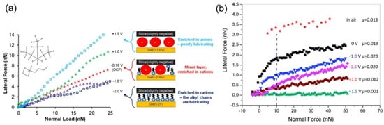 Ionic liquids (ILs), characterized as pure salts with melting points below 100 °C [89,90], have garnered attention for their versatile applications in batteries and supercapacitors as electrolytes [91,92] as well as their potential as lubricants [93] due to their high-temperature stability and low vapor pressure. The inherent conductivity of ionic liquids imparts remarkable electrical response properties, enabling the modulation of the adsorption behavior of anions and cations through the potential application, significantly impacting the tribological behavior at interfaces. As depicted in Figure 10a, the 1-butyl-1-methylpyrrolidinium tris(pentafluoroethyl) trifluorophosphate ([Py14] [FAP]) ionic liquid demonstrates a transition from cation enrichment at negative potentials to anion enrichment at positive potentials at the silica colloidal probe and Au(111) interface. This leads to a shift from low friction at negative potentials to high friction at positive potentials [20]. The low friction observed at negative potentials can be attributed to the strong electrostatic binding of cations to the substrate, preventing the ionic liquid from being extruded during friction, and the effective lubrication provided by the alkyl terminus of the lubricant film, which prevents interfacial sticking [20,94,95]. Conversely, the ionic liquid 1-hexyl-3-methylimidazolium tris(pentafluoroethyl)trifluorophosphate ([HMIM] [FAP]) exhibits an opposite potential-controlled frictional behavior between the sharp atomic force probe and the HOPG surface (Figure 10b). The friction force and coefficient are lower at positive potentials compared to negative potentials [96]. At negative potential, cations are enriched on the HOPG surface, forming a flat adsorption film. However, when the atomic force tip traverses the surface, the cations are attracted to the negatively charged tip and reorient to maintain overall electrical neutrality, consuming energy and increasing friction. Under positive potential, no reorientation of the anion repositioning occurs, and the enriched anion forms a smooth lubricating film, resulting in an ultra-low coefficient of friction and friction [96].