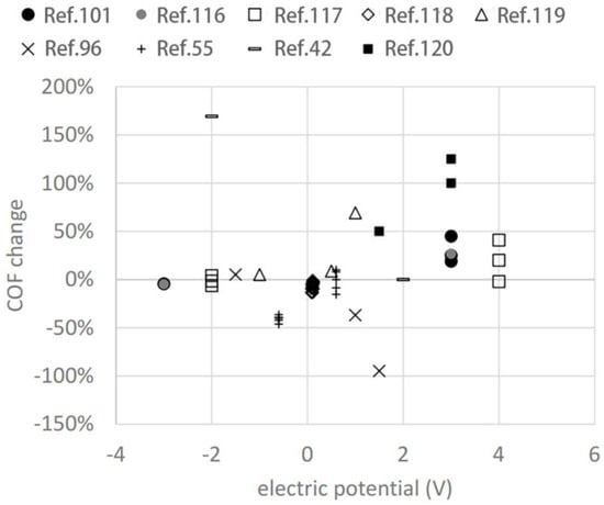 The change in the COF versus electric potential is derived from data presented in some typical papers [42,55,96,101,116,117,118,119,120]. Reproduced from [115]. CC BY 4.0.