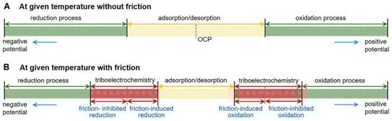Schematic diagram of the electrode processes at a given temperature without (A) and with (B) friction. Reproduced from [50]. CC BY 4.0.