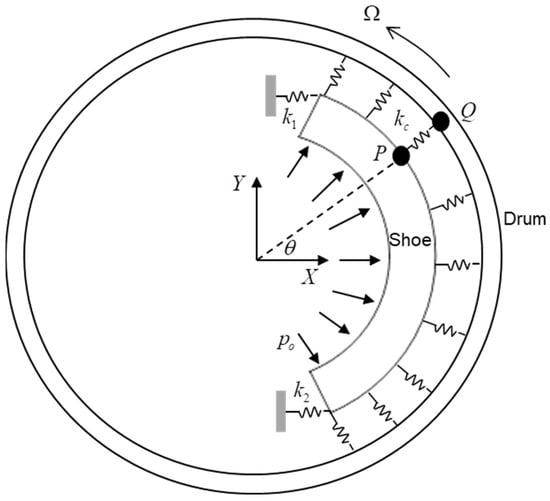 Configuration of the drum brake model; P and Q are the contact points for the brake shoe and drum, respectively.