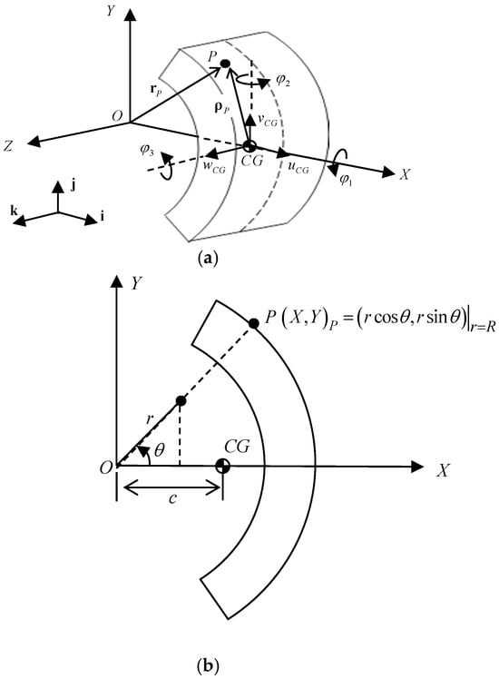 where are the unit direction vector in the X-, Y-, and Z-directions, respectively, h is the shoe thickness, is the outer radius of the shoe, and is the distance of the center of gravity (CG) from the origin (Figure 2b), which is calculated as