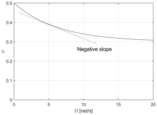 The velocity-dependent effects are reproduced as a friction–velocity curve in Figure 4, showing the magnitude and slope of the friction coefficient with respect to the relative speed between the mating friction materials. The values for the parameters in Equation (16) are , , and .