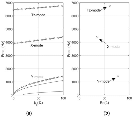 Figure 5a shows that the frequency loci increase with the contact stiffness. At , two modes have nonzero frequencies that correspond to one translation mode in the x-direction (X-mode) and one rotation mode in the z-direction (Tz-mode). These nonzero frequencies at originate from the supporting stiffness of the upper and lower support spring holding the brake shoe in the assembly. The other modes are the purely rigid modes that have zero frequency at . As the contact stiffness increases from zero, the zero-frequency rigid modes become nonzero-frequency vibration modes that represent potential squeal candidate modes. The positive real parts are marked in Figure 5a on their corresponding frequency loci if they are present, while the absolute values of the positive real parts at are plotted in Figure 5b. The two figures show that two translation modes (X-mode and Y-mode) and one rotation mode (Tz-mode) become dynamically unstable in the presence of contact stiffness and a negative slope in the friction–velocity curve.