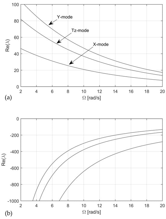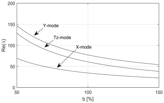 Parametric stability analysis is conducted by varying several system parameters when a negative friction–velocity slope causes squeal onset. In this analysis, only the real part loci of the unstable modes are traced. Figure 7 shows that the real parts of the unstable rigid shoe modes vary with the rotation speed of the drum. Figure 7a reveals that the squeal propensity of the unstable rigid modes increases with a decrease in the drum rotation speed. The negative slope mechanism arises from the negative slope matrix , whose elements require tangential displacement . This result corresponds with the fact that the two translation modes in the X- and Y-directions and the one rotation mode in the Z-direction generate tangential displacement, and is proportional to the decrease in the rotation speed. These three modes are not affected by friction-damping matrix because they do not have the z-component of their modal displacement vectors. That is why the squeal propensity is not suppressed when the rotation speed decreases.