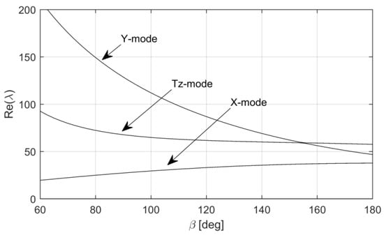 It is also important to investigate squeal propensity in relation to the geometry of the design parameters. In particular, the size of the brake shoe can be a focus of design modification. Figure 9 shows that the real parts of the unstable rigid modes change with variation in the contact arc angle. It is interesting that the real part of the Y-mode drastically decreases with an increase in the contact arc angle. In contrast, the change in the real parts of the X-mode and Tz-mode is relatively minor.
