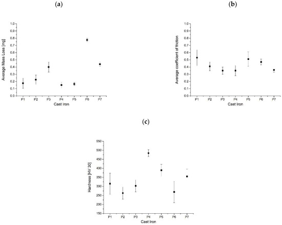 Results of the tribological properties and hardness of the materials under investigation: (a) average mass loss, (b) average coefficient of friction, and (c) hardness.