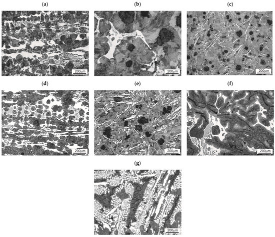 Microstructures of investigated materials: (a) P1, (b) P2, (c) P3, (d) P4, (e) P5, (f) P6, and (g) P7.