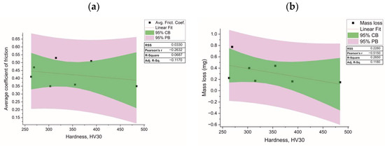 On the basis of the results obtained from the two-factor analysis of variance and the values obtained for the R2 coefficients of determination, it was decided to analyse the relationship between the hardness of the materials tested and the values of the coefficient of friction and mass loss for the cast irons investigated. The linear regression plot for this comparison, together with the marked confidence interval (green area) and prediction interval (purple area) for a statistical probability value of 95%, are shown in Figure 3.