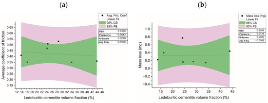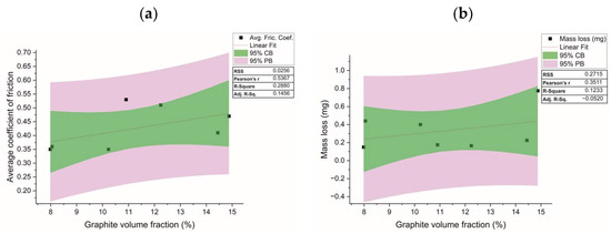 The regression curve with the prediction ranges for the effect of the changes in the volume fraction of graphite on the average coefficient of friction and mass loss of the samples is shown in Figure 5.