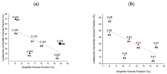 If the results of the tribological tests are compared with the volume fractions of cementite and graphite, it can be seen that the lowest mass loss values are observed for alloys P1, P2, P4 and P5. These alloys are characterised by a practically linear relationship of change between the cementite and graphite volume fractions. As the volume fraction of graphite increases, a gradual decrease in the cementite content is observed. In contrast, in materials such as P6 and P7, where extreme values for the proportion of graphite and ledeburite are observed, the values are higher (Figure 6a). The higher ledeburitic cementite content has a greater influence on the increase in the wear resistance of the material. Conversely, the highest volume fraction of graphite results in the lowest wear resistance.