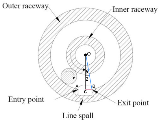 As shown in Figure 1, the angle formed by entry point A, the center of ball O, and exit point B are defined as . The distance between entry point A and exit point B is the length of the defect and is approximately a straight line when is very small. The angle between and is . When the angle is small enough, the relationship between the angle, radius, and the length of defect can be formulated as Equation (12):