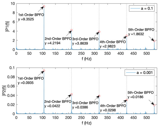 After introducing the construction of the bearing digital twin, it becomes evident that the updated parameters hold a pivotal role. In this subsection, an analysis will be conducted to determine the parameters requiring updates. The vibration response model generally comprises two primary components: one for load distribution and another for fault impulse decay. The parameters selected for identification will be drawn from these two functions. More specifically, the load proportional factor a plays a critical role in modeling load distribution, defining the range of load distribution around the bearing’s circumference. For a visual representation, please refer to Figure 3, which displays the envelope spectra derived from the vibration response signals under varying load proportional factors.
