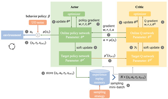 Once the signal-based model and the relevant parameters have been established, the subsequent crucial step involves devising an appropriate method for parameter identification. In this study, DDPG is employed as the strategy for updating the bearing digital twin model. DDPG is theoretically derived from Policy Gradient (PG) and its extension, Deterministic Policy Gradient (DPG). Unlike DPG, a core enhancement in DDPG is utilizing a convolutional neural network (CNN) instead of the traditional policy structure and value function. Furthermore, these networks are trained using deep learning techniques. For a comprehensive view of the DDPG structure and algorithm, please refer to Figure 4, which illustrates the nine main steps summarized in Algorithm 1.