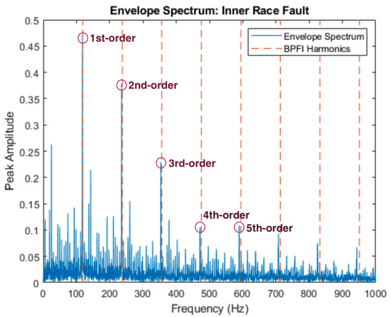 To verify the performance of the digital twin, an essential validation function is defined based on the envelope spectrum. The amplitude and frequency serve as two critical indicators within envelope spectrum analysis after normalization, considering their typical differences in scale [28]. The normalization of amplitudes is subtracting their mean value from the amplitudes of its first five orders and then dividing them by the standard deviation. As given in Equation (24), where stands for the amplitudes at fault frequencies, as shown with the three red circle positions in Figure 8, is the mean amplitude of the first five orders, and is their standard deviation.