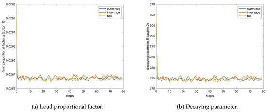 We can find that the load proportional factor affects the modeling results directly. In the envelope spectrum, the amplitudes at fault peaks will be magnified 100 times when the load proportional factor changes from to . Therefore, the load proportional factor can be selected as a parameter for the digital twin’s online updating. Additionally, the decaying parameter B is crucial for modeling the decay of fault impulse. It affects the decaying rate of the fault impulse. Generally, a large value of B will cause the fault peaks to decay quickly. Otherwise, a small value of B will slow the decaying process. Based on the above analysis, a and B will be selected as the updated parameters in the bearing digital twin model.