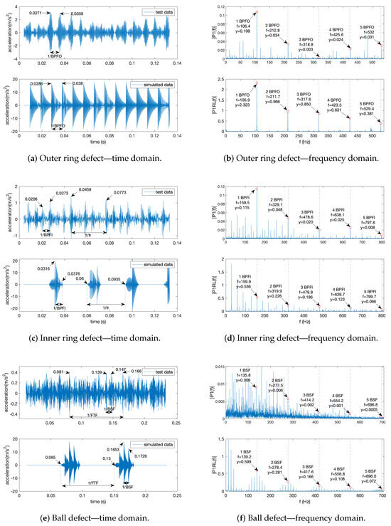 After training, the digital twin model can generate the acceleration response of the bearing under various fault conditions. Figure 10 compares the acceleration data produced by the digital twin and that obtained from the CWRU test bench in both the time and frequency domains. In Figure 10a, “test data” refers to the actual measurement data from the bearing test bench, while “simulated data” signifies the data generated by the digital twin. It is evident that the data generated by the digital twin closely resemble the actual measurement data in terms of overall trends and local features.