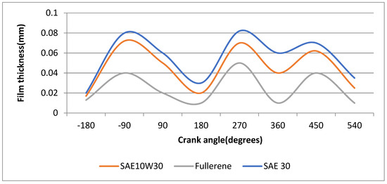 Figure 7. We observed that the lubricant 10W30 corresponds to a higher minimum film thickness while the fullerenes lubricants correspond to a lower film thicknesses. Respectively, SAE 30 corresponds to the highest values of film thickness among all the lubricants. This is observed in all phases of the combustion. This occurs since the lubricant with fullerenes as additives has a lower viscosity and retains its properties, as does the SAE10W30 lubricant, under all operating conditions.