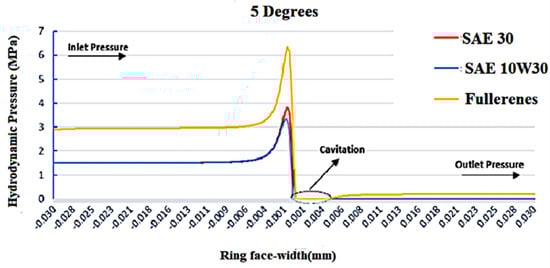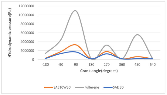 Figure 10, the hydrodynamic pressure is significantly higher when deploying lubricants using fullerenes as additives. When the strokes move on, and the crankshaft changes angle, the distribution of the pressure is expected to change. As seen in