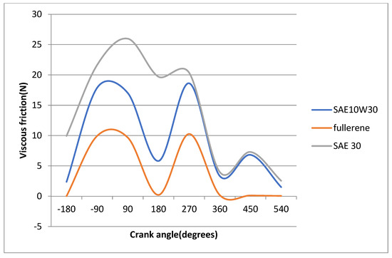 As expected, the pressure is higher if the film thickness is lower, and thus if the lubricant with C60 fullerenes as additives is used, the pressure is much higher. Consequently, the viscous friction, which causes wear and decreases the performance of the engine, has a notable difference between the three lubricants (