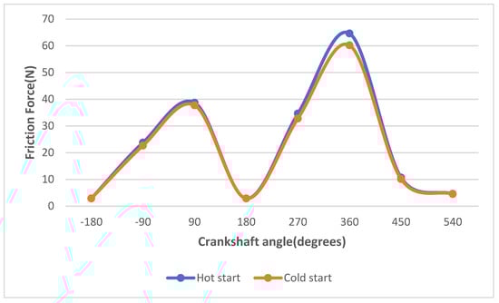 Figure 12). It is clearly observed that the roughness theory is of great importance and must be considered. Nevertheless, the temperature plays a key role in the lubricant’s properties and rheology. As such, we expected to see differences between the cold and hot start of an engine. A cold start is an attempt to start a vehicle’s engine when it is cold, relative to its normal operating temperature, often due to normal cold weather. A hot start, as expected, is the opposite situation.