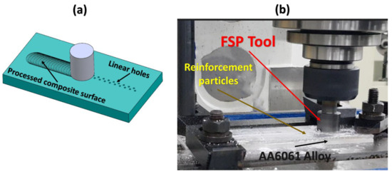 - Rathee, S.; Maheshwari, S.; Siddiquee, A.N.; Srivastava, M. Distribution of reinforcement particles in surface composite fabrication via friction stir processing: Suitable strategy. Mater. Manuf. Process. 2018, 33, 262–269. [Google Scholar] [CrossRef]