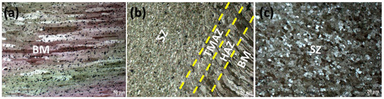 Optical microstructure images of the FSPed sample. (a) AA6061 base metal (BM), (b)mixed region of the stirred zone (SZ), thermomechanical affected zone (TMAZ), heat affected zone (HAZ), and base metal (BM) for AA6061 FSPed, (c) refined microstructure inside a stirred zone.