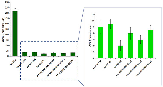 The base metal exhibited an average grain size of 210 μm, accompanied by an aspect ratio of 20:8. It was observed that the average grain size within the stirred zone (SZ) exhibited a reduction to 18 μm, accompanied by the presence of virtually equiaxed grains. The average grain sizes in the solidified zone (SZ) for the mono-composite vanadium carbide (VC), boron nitride (BN), and hybrid-composite (AA6061/30%BN+70%VC and AA6061/70%BN+30%VC) were measured to be 14 and 17 μm, respectively. Table 2, shows the Statistical analysis showed a statistically significant difference in the average grain size of the different composite samples (Figure 5). The hybrid composites with fewer BN particles had the smallest grain size (AA 6061/30%BN+70%VC and AA 6061/50%BN+50%VC) apart from the mono-composite AA6061/30%VC. There are several potential explanations as to why (VC) demonstrates a greater capacity for refining the grain structure of the aluminum AA6061 alloy during (FSP) compared to (BN). Hence, it exhibited lower thermal stability compared to (VC). During FSP, the material undergoes exposure to elevated temperatures. (VC) exhibited greater deformation resistance at elevated temperatures than (BN), enhancing its ability to maintain structural integrity and serve as an effective pinning site for grain boundaries. (VC) exhibited a comparatively elevated melting point compared to (BN). This implies that adding VC can effectively mitigate the occurrence of grain boundary melting and subsequent recrystallization during (FSP). The chemical reactivity of the (VC) with aluminum was greater than that of BN. This phenomenon implies that (VC) can establish a more robust interfacial connection with the aluminum matrix, enhancing its efficacy in impeding the motion of grain boundaries.