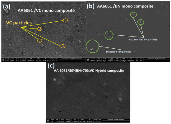 SEM image of (a) AA 6061/VC mono composite, (b) AA 6061/BN mono composite, and (c) AA 6061/30%BN+70%VC hybrid composite fabricated using friction stir processing.
