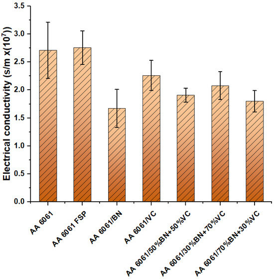 The electrical conductivity of the aluminum alloy AA 6061 in its pure form is estimated to be around 2.76 × 107 S/m. This study incorporated semiconductor vanadium carbide and insulating boron nitride particles into a composite matrix to investigate their effects in both single and hybrid forms. The enhanced electrical conductivity of vanadium carbide compared to boron nitride can be attributed to its greater abundance of free electrons, which facilitate the flow of electric current. VC has semiconductor properties, while boron nitride demonstrates insulating characteristics. VC has a narrow band gap, facilitating electron movement between different energy levels. The increased mobility of electrons leads to an elevated level of electrical conductivity [37].