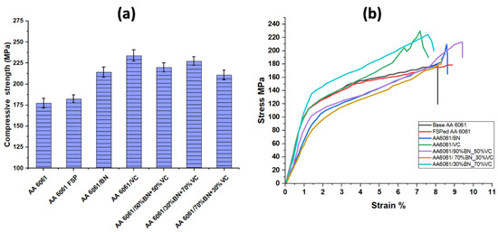 (a) Comparative compressive strength of AA 6061 and their composites, (b) stress–strain curve of the investigated samples.
