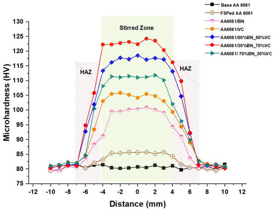 The microhardness profile of the hybrid-composite sample AA6061/30%BN_70%VC exhibited a greater degree of symmetry compared to the microhardness profiles observed in the remaining composite samples. This hypothesis is plausible due to the higher proportion of VC particles in the AA6061/30%BN_70%VC sample, which exhibited a more homogeneous distribution throughout the matrix. In general, the findings from the microhardness profile analysis indicate that the friction stir processing (FSP) technique is a viable method for producing AA 6061 alloy and its composites, as it yields various microhardness values. The microhardness of the material can be modified by manipulating the composition and quantity of the reinforcing particles employed. The consequences of the microhardness profile results are significant to the design and development of AA 6061 alloy and its composites. The findings indicate that hybrid composite samples containing an equal proportion of BN and VC particles can yield materials with the highest microhardness values.