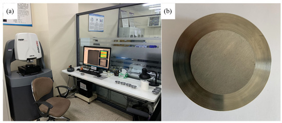 As shown in Figure 2a, ZYGONexView (ZYGO Connecticut, Middlefield, CT, USA), a practical 3D white light interferometer tested in this paper, is a high-linear-capacitance sensor. The accuracy of the instrument is to ensure the full range of 0.1 nm in 0–150 μm to ensure real and effective measurement results. Figure 2b shows the specimen obtained by grinding.