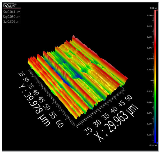 Figure 3 shows the 3D micromorphologies of grinding specimens obtained by 3D white light interferometer test. By observing their appearance, many strips of asperity are shown to be evenly and neatly distributed on the surface of the specimen, and the surface asperity is undulating, concave and convex, and the groove texture is clear.
