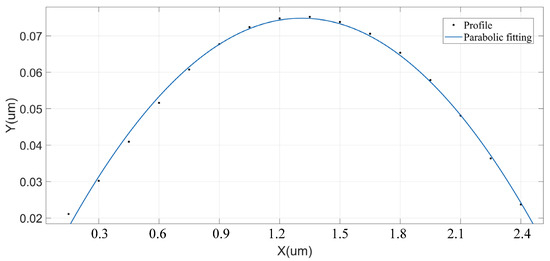 In order to reveal the real topography characteristics of the rough surface, the actual contour characteristics of a single asperity are tested. Then, the parabolic function y = nx2 + mx + l is used to fit the profile data points of the asperity cross-section. The fitting results are shown in Figure 4, and the fitting data points of the profile of the asperity cross-section are basically consistent with the curve of the parabola function. This proved that the distribution of data points of a single asperity cross-section on the rough surface obtained by grinding is close to the parabolic function curve.