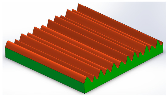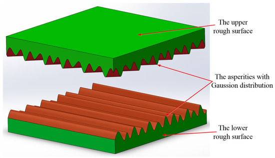 According to the above fitting analysis, the distribution of the data points of the cross-section of a single asperity on the rough surface is close to the curve of the parabolic function, and the height distribution of the asperity conforms to the Gaussian distribution law. Based on the above research results, this paper establishes a hypothetical surface with parabolic cylindrical asperity cross-section profile, and the height of asperity follows the Gaussian distribution law. As shown in Figure 6, it is assumed that the surface is more consistent with the real surface topography characteristics of grinding.