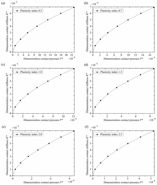 Figure 8 shows the numerical simulation curves of the dimensionless contact stiffness and dimensionless contact pressure of the assumed rough surface, with plasticity indices of 0.5, 0.7, 1.0, 1.5, 2.0 and 2.5, respectively. The material is 304 steel; elastic modulus is E = 195 GPa; hardness H = 1870 MPa. Figure 8 shows the influence of different plasticity indices on normal contact stiffness. It can be seen from the figure that the contact stiffness increases with the increase in contact pressure. When the contact pressure is the same, the normal contact stiffness increases with the increase in plastic index. This is because the physical meaning of the plasticity index is to determine the elastic–plastic contact characteristics between two surfaces. When the contact load increases, the contact stiffness increases, and the increase in the contact stiffness of the surface with a high plasticity index is higher than that of the surface with a low plasticity index, which verifies the validity of this model.