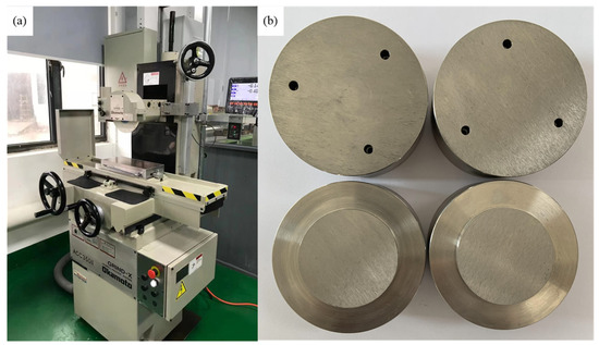 The rough surface of the specimen in this experiment was obtained by grinding, and the material was 304 steel. The parameters of No. 304 steel are obtained by mechanical experiments: Young’s modulus E1 = E2 = 195 GPa; Poisson’s ratio ν1 = ν2 = 0.29; hardness H = 1870 MPa. Figure 9a shows the processing and molding equipment of this experiment specimen. The model is an okamoto ultra-precision static press surface grinding machine (Okamoto, Tokyo, Honshu, Japan), upg series. Figure 9b shows the normal contact stiffness test specimen. The bonding surface is the convex surface obtained by grinding, and the height of the convex surface is 2 mm. The roughness of the joint surface was Sa 0.854 μm, Sa 1.173 μm, Sa 1.391 μm and Sa 1.524 μm, respectively.