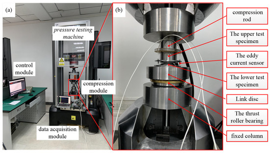 As shown in Figure 10, in order to verify the accuracy of the model presented in this paper, a normal contact stiffness test platform was built. Figure 10a shows the execution devices of the test platform, including four parts: pressure testing machine, compression module, data acquisition module and control module. The pressure testing machine is a W.D.W. series microcomputer controlled electronic universal testing machine (5–20 KN); the equipment test error is less than ±0.5%. Figure 10b shows the compression module, which consists of seven parts: compression rod, upper specimen, eddy current displacement sensor, lower specimen, link disk, thrust roller bearing and fixed column. The eddy current sensor is a KAMAN(KAMAN Bloomfield, CT, USA) high-precision eddy current displacement sensor, model KD2306-2U. The measuring accuracy is ±0.1 μm, the measuring range is 0–1 mm, and the output voltage is 0–10 V. The data acquisition module uses an Altai data collector, model PCIe5653.
