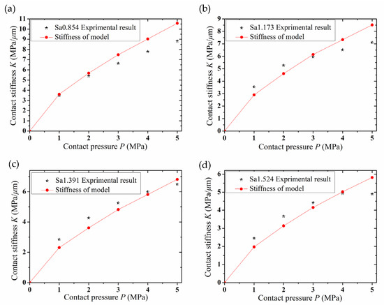 In order to verify the reliability of the proposed model, the simulation stiffness of the proposed model is compared with the experimental stiffness. Roughness is an important parameter that determines the precision of the machined rough surface. The roughness values of four rough surfaces, Sa 0.854 μm, Sa 1.173 μm, Sa 1.391 μm and Sa 1.524 μm, were obtained by grinding in this experiment to verify the validity of the model. Figure 11 shows the comparison result curve between model simulation stiffness and experimental stiffness.