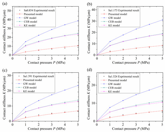 In order to verify the accuracy of the new model, the stiffness values of the present model, GW model, CEB model and KE model were compared with those of the experimental test. Figure 12 shows the comparison between the experimental contact stiffness values of Sa 0.854 μm, Sa 1.173 μm, Sa 1.391 μm and Sa 1.524 μm of test samples with different roughness values and the simulated stiffness values of each model.
