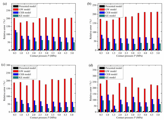 The comparison and relative error analysis results of the above models show that the GW model has the largest relative error because the GW model simplifies the contact between two rough surfaces to the contact between a spherical asperity and a rigid plane, and assumes that only elastic deformation occurs in the asperity. Without considering the influence of plastic deformation, it does not conform to the real contact mechanism, resulting in a large error. The CEB model assumes that the volume of the asperity remains unchanged during the contact process, the plastic deformation factor is considered, and the error is smaller than that of the GW model. However, the CEB model assumes that the asperity is in contact with the rigid surface as a spherical asperity, and the model topography assumption is not consistent with the real contact situation, resulting in poor model accuracy. The KE model assumes that the rough surface asperity is spherical asperity, and the deformation of asperity is divided into the elastic stage, elastoplastic stage and complete plastic stage. Compared with the GW model, the error is lower. However, the KE model assumes that the contact of the bonding surface is the contact between a spherical asperity and a rigid plate. This deviates from the real contact condition, resulting in error in the model simulation value. The model proposed in this paper establishes a parabolic cylindrical asperity model by fitting the real rough surface data. This is consistent with the real contact of the bonding surface. In this model, the deformation of asperity is divided into the elastic deformation stage, elastoplastic deformation stage and complete plastic deformation stage. Therefore, the simulation results of this model are better than those of the GW, KE and CEB models.