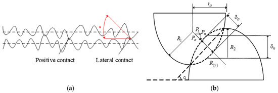 As shown in Figure 3, a pair of laterally contacted asperities were selected. The contact angle between asperities is represented by ; is the contact load; and and are the horizontal and vertical components of , respectively. The following expressions are known from the geometric relation of graphs: [16]. The relationship between the asperity lateral contact deformation and the asperity positive contact deformation is: