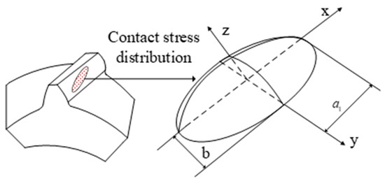 The contact between the helical gear surface is point contact. When the load is applied, the contact point expands instantaneously into an ellipse. When point contact is extended to elliptical contact, the stress distribution on the contact surface of the ellipse is shown in Figure 5.