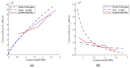 The model was validated by comparing it with other relevant prediction models and experimental data. Figure 7a shows the comparison of the NCS model of the solid part in this paper with the prediction model and experimental data in Ref. [9]. The experimental material was gray cast iron, the specific parameters are listed as follows: E = 130 GPa, HB = 231, fractal dimension D = 1.3504, . The gear surface correction coefficient was set to 1, which is equivalent to the contact between two planes. It can be found that the change trend of the model in this paper was consistent with Wang’s model [9], and the model in this paper was relatively closer to the experimental data. Although Wang considered the effect of the interaction of asperities, they were all derived under the positive contact. Wang’s model only considered the elastic and plastic deformation stages of the asperity without considering the elastic–plastic deformation stage, so the larger the load, the greater the difference in NCS values between the two models. Moreover, in Wang et al.’s model, the contact between rough surfaces only considered the contact deformation of the asperity, and the load was only borne by the asperity. In the model presented in this work, the matrix was considered an elastic body, and the load was borne jointly by the asperity and the substrate. In addition, the common influence of the asperity lateral contact and interaction on the contact model can be observed in Figure 7b. It shows the comparison between the model of comprehensive NCS () in this paper and the prediction model and experimental data in Ref. [26]. The specific material parameters are listed as follows: , , in which the D = 1.342, . And the variation trend of the model in this paper was close to that of Xue’s model [26] and was consistent with the change in the experimental data. This further verifies the accuracy of this model. Moreover, decreased with the increase in load when the contact load was small, which can also be seen from the subsequent analysis. This is because the comprehensive equivalent NCS was dominated by the oil-film NCS.