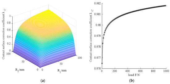 According to Equation (19), the main factors influencing the correction coefficient of helical gear surface were the curvature radii and , and the unit line load . By controlling these variables, the influences of and on the gear surface correction coefficient were analyzed. As shown in Figure 8a, it can be found that the variation trend of with or with was roughly the same. With the increase in curvature radius, the increased, but was always less than 1. This is consistent with the setting of the correction coefficient, that is, the number of asperities in curved-surface contact is always smaller than that in plane contact. Moreover, when the radius of curvature approaches 0, the correction coefficient approaches 0, which means that there is no contact between the two rough, curved surfaces. When the radius of curvature approaches infinity, the correction coefficient approaches 1. The contact between two rough, curved surfaces is equivalent to that between two planes. In Figure 8b, when F approaches 0, is not 0, and there is no contact stress between the two contact bodies. However, due to the existence of contact entities, is not equal to 0. With the increase of load, also increases. The growth rate of gradually slows down, and is always less than 1. This is because the micro-topography makes it impossible to completely fit the two contact surfaces. Therefore, increasing the load appropriately and increasing the real contact area are conducive to improving the contact strength. The above analysis fit the classical contact theory [1], which can be verified by the rationality of the choice of .